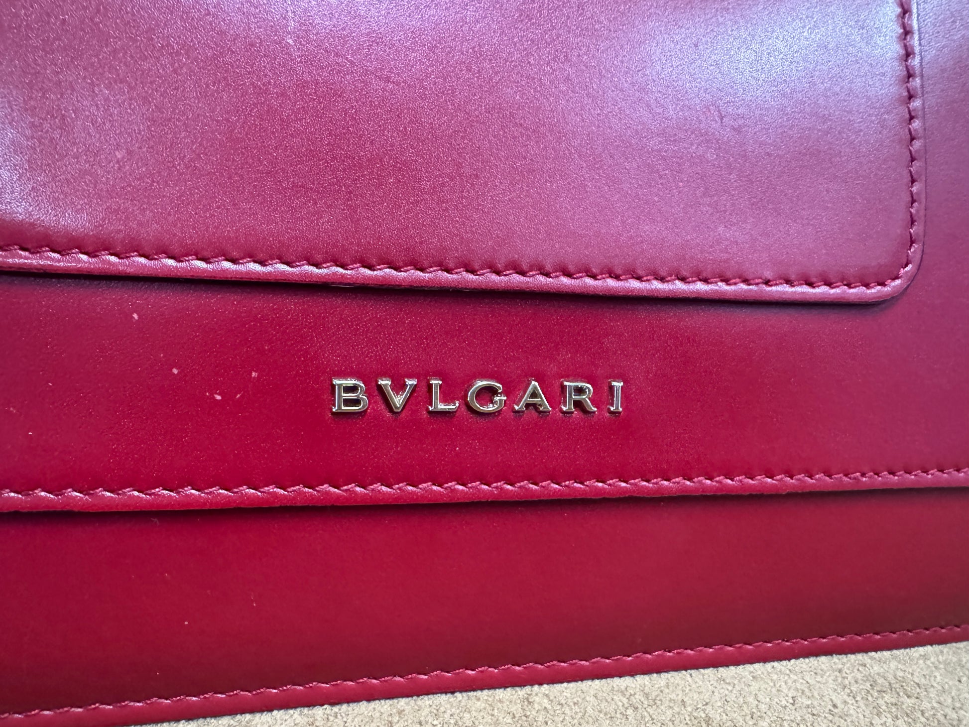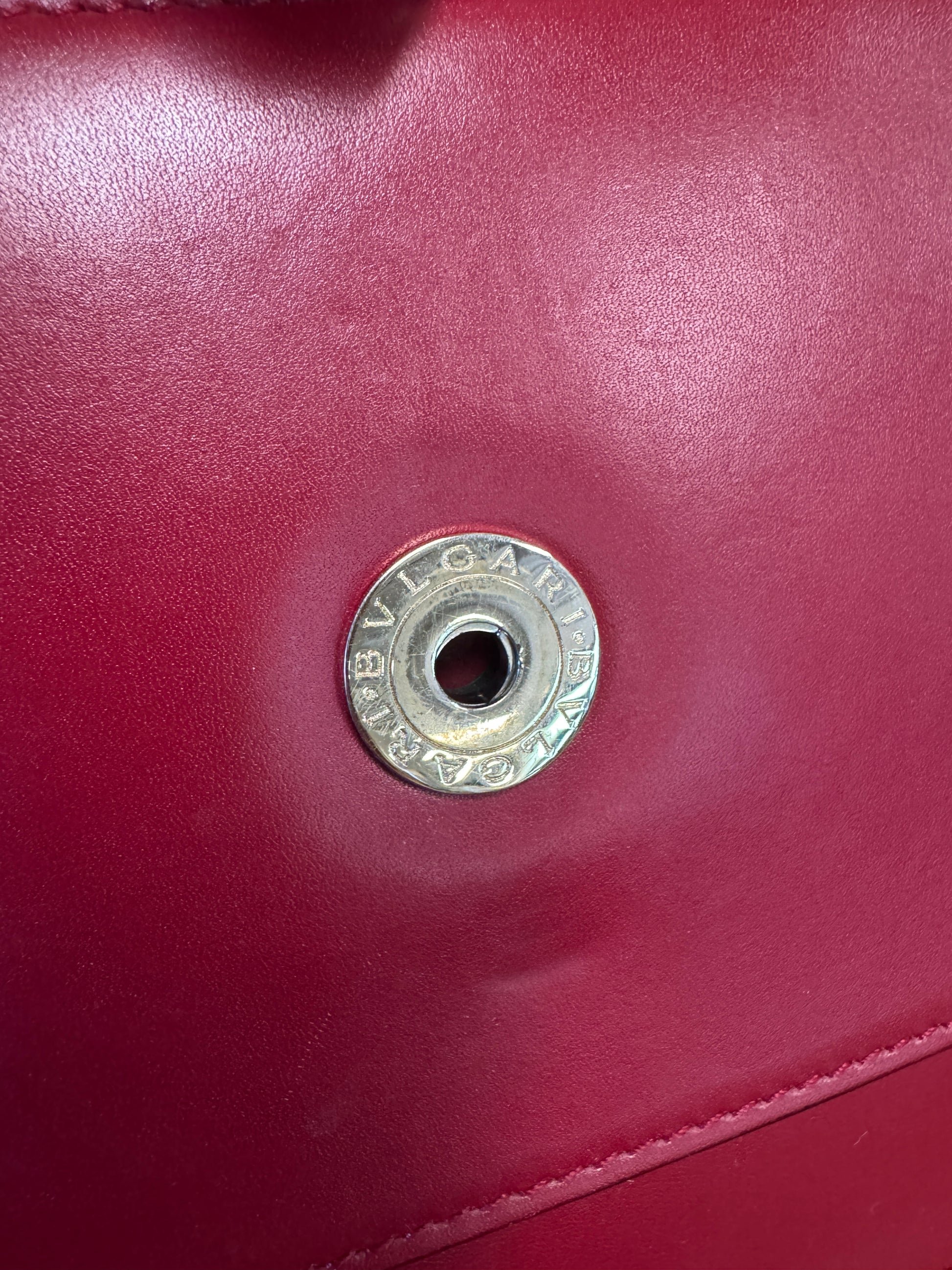 - Bvlgari-engraved silver-tone snap stud on flap interior