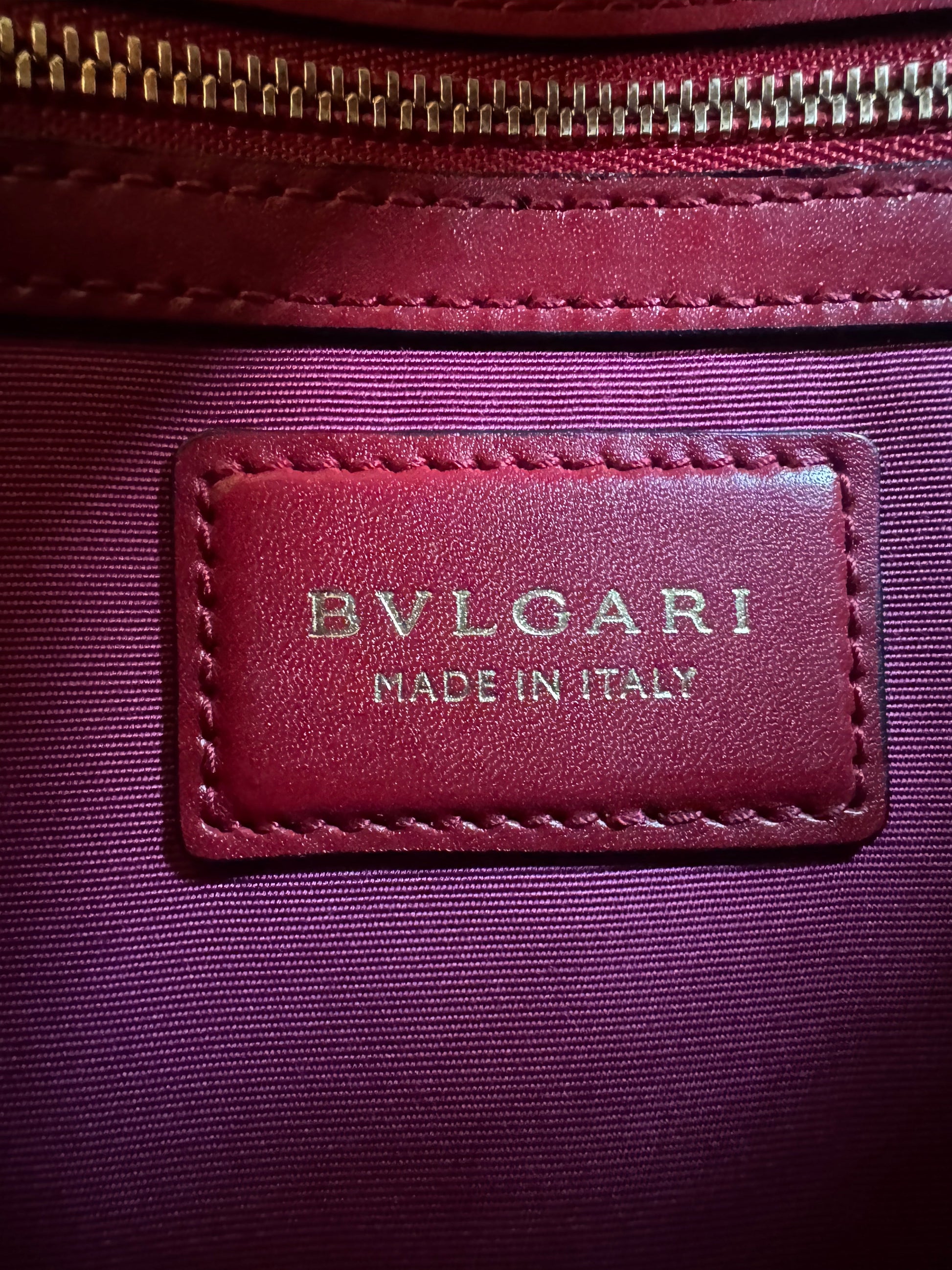 - Bvlgari leather interior label stamped "Made in Italy"